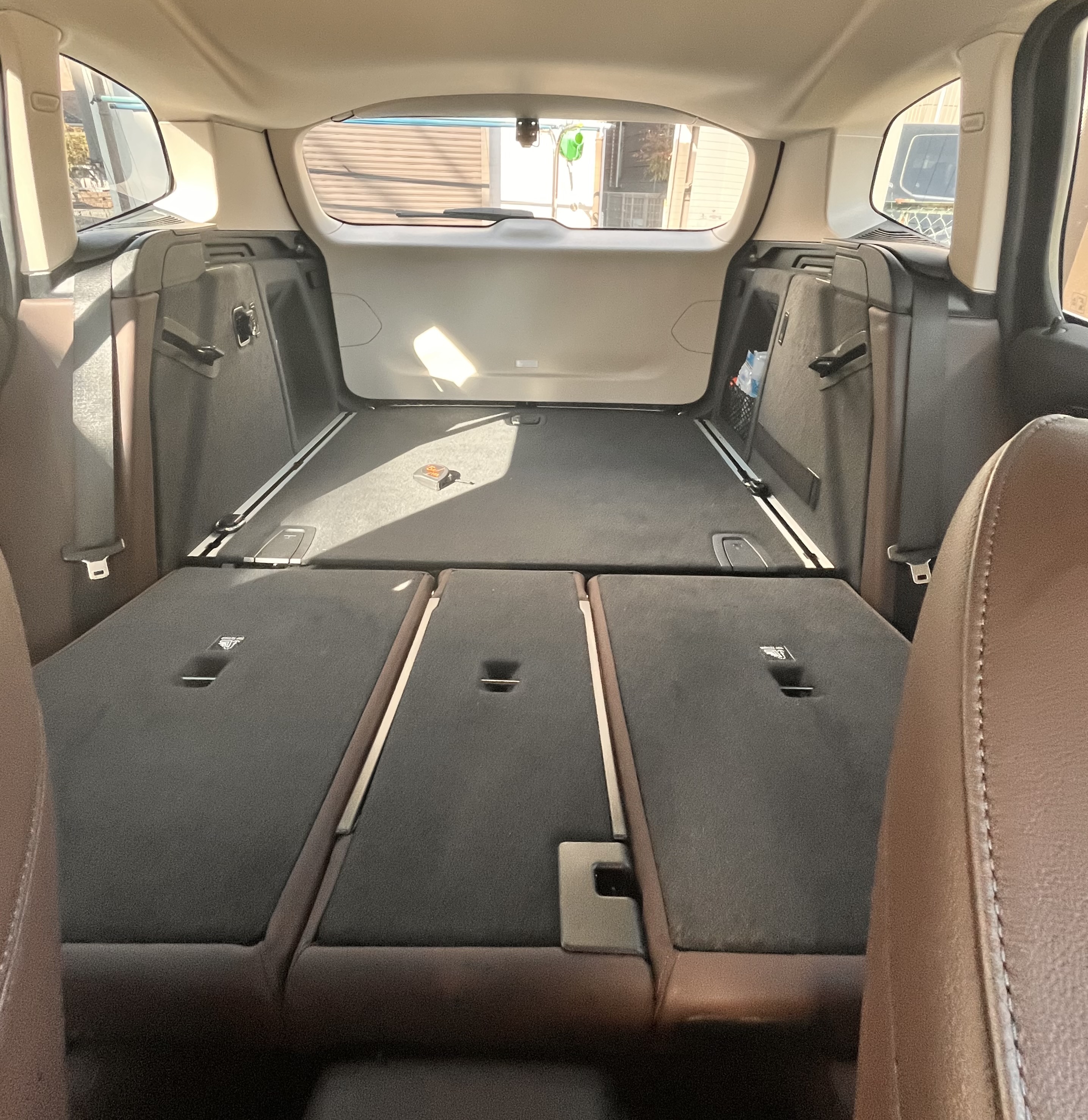 こんにちは!いつも訪問頂き有難うございます。「BMW X3で車中泊は出来るのか?」ということで、実際にX3 G01の後部空間を実測してそこに快適に寝ることが出来るのか調べてみました。荷室の空間を実測している記事って意外とないみたいですので、X3の購入を検討している方は是非とも参考にして下さい!これは全席から後方を撮った写真ですが、こうしてみると凄く広く見えますね。これだけ広ければ3人ぐらいは余裕で寝れそうに見えますが、これに騙されてはいけません。先ずは空間の高さから見てみましょう。一番後方の床面から天井までの高さです。約78cmあります。もっと低いかと思いましたが、意外と高さが確保されています。次にカーゴ部分の一番前のあたり、リアシートはフラットではなくて、前方が高くなっていますので、このあたりが一番高くなります。とはいいましても、約82cmしかありません。小柄な方とかですと、座ることも可能です。身長178cmの私の場合ですと、あぐらをかいていれば頭は天井にぶつからないレベルです。そして一番前の位置です。倒したリアシートの前方部分がフラットにはならずに意外と高くっています。高さは約76cmといったところです。X3の後部スペースは概ね、80cm前後となっていますので、車内で活動するにはちょっと厳しいですね。あくまでも「寝るだけ」のスペースと考えた方がいいようです。では問題の縦方向の「長さ」を見てみます。先ずは「真っすぐ」の長さです。ちなみに前車のVOLVO XC40は、150cmありましたが、X3はどうでしょうか?クルマの長さが28cmも長くなっているので、かなり期待していました。が、あらら、何と、残念ながら160cmでした~XC40よりも僅か10cmしか長くなっていませんでしたね。この長さですと、165cmぐらい迄のかたならまっすぐでも寝れそうですよ。では178cmの私が寝てみますと、膝を立てなければ無理でした。では頭を逆にしてみましょうか?これぐらい膝が曲がってしまいます。それと頭が低くなっていますので、頭に血が上りそうです(笑)ちょっと無理ですよね。つぎに斜め(対角線)の長さです。これで計ってみますと、意外と長くて190cmです。これだけあれば普通の人であれば大丈夫でしょう。ちなみに、普通の人である私(178cm)が寝てみますと、余裕でした!一人で寝るのなら「斜め寝」、二人で寝るのなら、前席との隙間に、クッションでも挟めれば大丈夫だと思います。X5とかXC90とかなら余裕で車中泊出来そうなんですが、それだけの為にデカい(高い)クルマを買うわけにもいきませんよね(笑)今回は、BMWX3で車中泊が出来るかどうかを実測してみました。(参考記事)VOLVO XC40車中泊フラット化作戦VOLVO XC40車中泊チャレンジ最後まで読んで頂き有難うございます。このブログはにほんブログ村の人気ランキングに参加しています。よろしければポチっとお願いしますね! ↓にほんブログ村にほんブログ村にほんブログ村