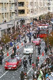 千葉ロッテが優勝パレード紙吹雪が舞う中、パレードするロッテの選手たち20日正午、千葉市美浜区で紙吹雪が舞う中、パレードするロッテの選手たち=20日午前11時57分、千葉市美浜区で31年ぶりのプロ野球日本一に輝いた千葉ロッテマリーンズの優勝パレードが20日、千葉市中心部と、千葉マリンスタジアム周辺の2カ所であった。計約24万人が、「優勝おめでとう」「夢をありがとう」と声援を送った。 バレンタイン監督が住む幕張ベイタウンでは、マンションのベランダや屋上から住民手作りの紙吹雪が舞い、選手らを祝福した。パレードに引き続き、千葉マリンスタジアムではファン感謝イベントも開かれた。