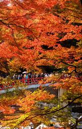 紅葉の見ごろを迎えた香嵐渓。待月橋の周辺は観光客で混雑した=19日午後、愛知県豊田市足助町で紅葉の名所、愛知県豊田市足助町の香嵐渓は、ここ数日の冷え込みでカエデの色づきが急速に進んだ。19日は今シーズン最高の約2万5000人が紅葉狩りを楽しんだ。約4000本あるカエデの紅葉を見ようと観光客が詰めかけ、巴川にかかる待月橋の両端には長い行列が出来た。足助観光協会によると、盛りは23日前後から次の週末になりそうという。30日まで、日没から午後9時までライトアップされている。