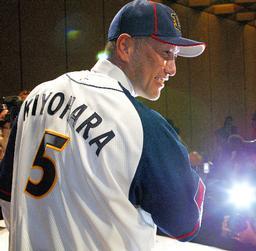 「ファンのために全力」 清原がオリックス入団会見背番号が入ったオリックスのユニホームを着る清原巨人を自由契約になり、オリックス入りを表明していた清原和博内野手(38)が26日、正式に契約を結び、大阪市内で記者会見した。契約期間は1年、推定年俸は2億5000万円プラス出来高。背番号は巨人時代と同じ「5」に決まった。清原は、昨年から誘ってくれた前オリックス監督の故・仰木彬氏に「感謝したい」と語り、プロ21年目で出身の大阪に本拠を置く球団に初めて入ることについては「オリックスのために、ファンのために全力でプレーしたい」と笑顔で話した。通算本塁打514本は史上5位。あと22本で、王貞治、野村克也、門田博光に次ぐ4位の山本浩二の536本に並ぶ。「みなさんのドキドキするような場面で一本でも多くヒットやホームランを打ちたい」と抱負を述べた。
