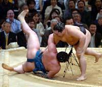 大相撲春場所11日目全勝同士のモンゴル勢対決は、関脇白鵬が横綱朝青龍を右上手出し投げで破って単独トップに立つ11連勝、大関昇進に大きく前進した。初黒星の朝青龍は白鵬戦2連敗。栃東は大関同士の一番で魁皇に寄り切られ3敗目、今場所後の綱とりは絶望となった。かど番脱出を目指す魁皇は5勝6敗。大関琴欧州、千代大海はともに勝って勝ち越し。千代大海は9度目のかど番を脱出した。全勝の白鵬を1敗で朝青龍が追い、2敗で平幕の若の里が続いている。十両は把瑠都が11戦全勝で依然単独首位。
