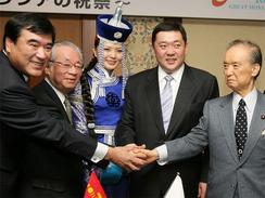 モンゴル建国800年記念の騎馬隊イベントショー、今夏開催モンゴルで今夏行われる騎馬隊イベントショー「チンギス・ハーン800年目の帰還~ユーラシアの祝祭~」の記者発表会で関係者と握手するミエーゴムビン・エンフボルド・モンゴル首相(右から2人目)らモンゴル建国800年記念祭の一環として今夏、同国で行われる騎馬隊イベントショー「チンギス・ハーン800年目の帰還~ユーラシアの祝祭~」(モンゴル政府など主催)の記者発表会が29日、東京都港区のホテルオークラ東京で開かれた。来日中のミエーゴムビン・エンフボルド首相は「500頭の騎馬隊の行進に、世界の誰もが目を引くだろう」と、記念祭の核となる史上最大級のショーに期待を示した。同ショーはモンゴルの国家的行事として7月 10日にスタートし、8月31日までに計30回開催される予定。会場は首都ウランバートル中心部から車で約45分の中央県セレグレン郡トゥグリク村で、観客席は3000席用意される。モンゴル政府などは、ショー効果で世界中から6万人以上の観光客が同国を訪れることを期待。記念祭に協賛する旅行会社エイチ・アイ・エス(HIS)などがツアーを企画し、期間中に日本からも7000人の観光客を送り込みたいとしている。モンゴル国防省の協力で、騎馬隊はすべてモンゴル軍で構成される。広大な草原を背景に、13世紀の兵法や戦術、人と馬とのかかわりなどが再現される。ショーは約2時間の予定。企画の発案者で同祭実行委員会の堺屋太一・特別顧問は「遊牧民はモノを残さないため、モンゴルには城などの歴史的建造物はほとんどないが、チンギス・ハーンの時代とほとんど変わらない大草原がある。史実に忠実に再現された凱旋(がいせん)シーンをぜひ見てほしい」と語った。同ショーの入場券は、モンゴル国内のホテルやツーリスト・インフォメーションのほか、世界各地の旅行会社などでも販売される。