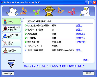 日本エフ・セキュアは、個人向けセキュリティソフト「F-Secureインターネットセキュリティ2006」を4月17日に発売する。親会社があるフィンランドにちなみ、操作画面には「ムーミン」のキャラクターを採用。「たいくつなセキュリティ製品を心和むものに」ウイルスとスパイウェア対策機能、ファイアウォール機能、スパムメール制御機能などを備えたセキュリティスイート。個人や小規模オフィスでの使用を想定し、「簡単な設定と全自動運用が特徴」としている。対応OSはWindows 2000/XP。価格は1ユーザーパッケージ版が9660円、同ダウンロード版が5775円。同社が国内で個人向けソフトを販売するのは初めて。後継製品を含め、3年後に年間100万ライセンス、50億円の販売が目標とか。