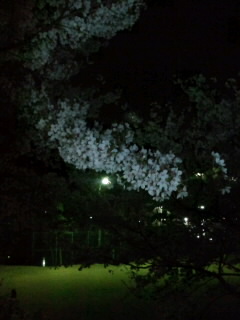 今日、仕事の帰りに橋の上で信号待ちをしていると、川沿いに植えてある桜が、結構咲いていた。まわりの微かな灯りに照らされ、なんとも幻想的でした。あかるい日のひかりを浴びた満開の桜もいいけど、こんな桜も良いもんです。