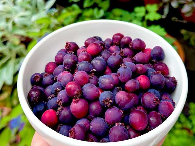 補足: ベリーが 熟した順に収穫していかないと、 落下してアプローチの敷石を汚したり、 ヒヨが食べにきてプリッと「落とし物」したり・・・と、色々面倒。 去年は収穫タイミングを逃して大雨で完熟ベリーの大半を落下させちゃった。同じ 轍は踏みたくない一心。
