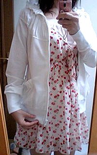 BUZZ-exさんのお洋服、ホントに可愛いですネ~♪でも、さすがに歳不相応で、いつも眺めているばかりでしたが、さくらんぼと猫好きなので、コレは思わず買ってしまいました☆見ているだけで…ラブリーチェリーシフォンワンピースメルヘンワールドへようこそキラキラ☆猫ちゃんの夜ワンピースチェリー柄のは、さくらんぼ狩りの時に着て行きました~。パーカーはニッセンのデス☆でもフリルで細身でジッパーも白で割と可愛いのデスwさくらんぼ狩りで脚立に上るのでスニーカーはきましたが、普段はサンダルなんかをはいたほうが可愛いですネ♪さすがに会社には着ていけないので休日向けデス。ねこの王様柄もカワイイ♪ 夏の休日かリゾート向けかなー。パフスリのジャケットなんか着れば、会社にもいいかなぁ☆んー、ハイウエストだから、マタニティ化するな…やっぱダメだ☆涼しいサラサラした生地で透けますが、インナー用の長い白いキャミ付で気が利いてました♪