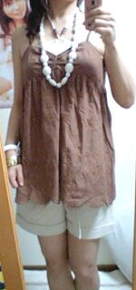 先日、ネタバレしたワンコイン、ホンコンマダムさんのボーダーニットが、本日、無事に、LOTS OF LOVE さんのブラウン刺繍チュニックに変身しました~好みのタイプのに交換してもらえてよかった~Sさん、どうもありがとうございました~早速、着てみました~茶色のドット花柄ワンピと似てて、胸の切り替え位置が高いのですが、コレは肩ヒモの長さが調節できるので、胸のトップより下にできてよかったデス。とりあえず無難なベージュの短パンと合わせてみましたー。これは、デザインが大きめに作ってあるようなので、ぶかぶかですが、あんまり広がらないから、このまま着てもいいかなぁ…。ちょとアンダーをリボンで縛ってみた。スカートでも大丈夫…かなー?LOLブラウンシスターズの誕生となったのでしたー♪