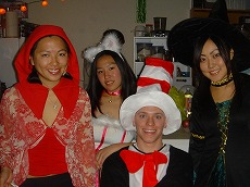 今日は、一日早いHalloween Party!!本場(?)のHalloweenは初だからワックワク♪でも、コスチュームを着なきゃいけなかったんだよね・・・(-_-;)まさかこの歳になってコスプレすることになるとは思ってもみなかった・・・ほんと、人生何があるかわからない・・・でもせっかくだし、楽しまなきゃ損だと思い、途中から開きなおったぞ!!Witch(魔女)のコスチュームで参上しました!!理由は一番安かったというだけです・・・(・_・;)でもね、さすがアメリカ人だよね!!みんなおもしろい!!自分を捨ててるところがステキでした☆(詳しくは初めて作ってみたアルバムをどうぞ!最初は写真撮りまくってたけど、後半は話に夢中になり、ほとんど撮っておりません・・・)時間がたつにつれて、次から次へとやってくる人たち。20人以上は来てたね。今日初めて会う人もたくさんいた!!で、友達の一人に「今日は日本人一人だけだね」って言われて気がついたのさ!!ほんとだ!!私以外みんなアメリカ人ぢゃん(+_+)意味もなく一気に不安になってきた私・・・でも結果としては英語話すいい練習になったからよかったよ☆(ちなみに、Party終盤になってやっと日本人2名ほど来ました!) そして、おもしろかったのがリンゴ大会!!水に浮いてるリンゴを口だけで取るっていうもので、かなり笑えた(^▽^)右の写真の女の子なんて、完全に頭から突っ込んでたし(笑)ちなみに私はずっと見て笑ってました(^_^;)さすがに挑戦はしなかった・・・ 今日はいろんな人といろんな話ができてほんとに充実のPartyだった☆★☆ただ、もっと写真撮ればよかったなぁ(>_