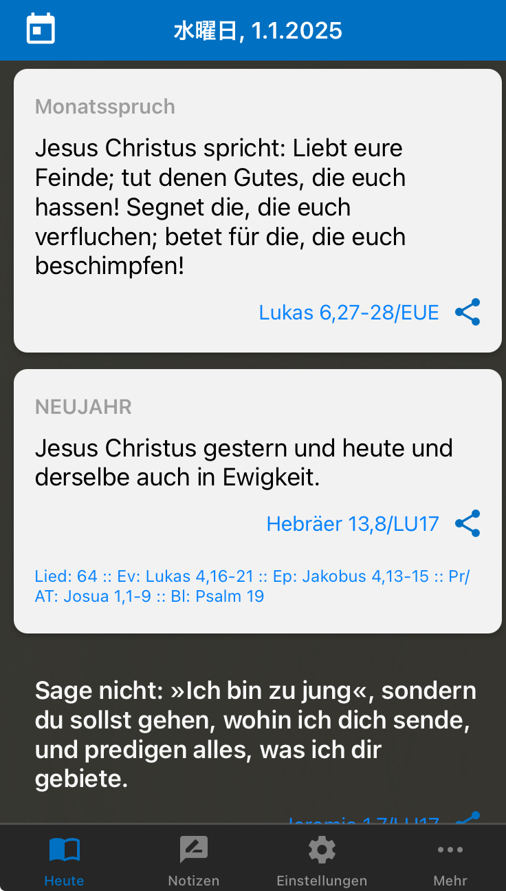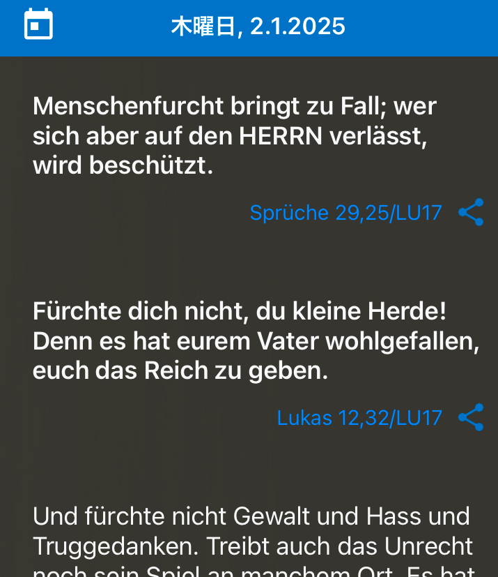 旧約聖書人間への恐れは罠に陥れるが、主に信頼を置くものは、守られる。 箴言29:25新約聖書小さな群れよ、恐るな。なぜならあなた方の父は、喜んで神の国を与えてくださるから。ルカ12:32第三のテキスト権力(暴力)、憎悪、裏切りの考えを恐れるな。不正とあらゆる場所にある戯れ事を退けよ。それは、神がご計画される以上の大きな力ではない。終わりにおいて、愛が最後の言葉なのだ。黙想正直なところ、新しい年を迎えて恐れがあります。何があるかわからない不安というよりも、自分自身に課せられる責任を思う時。家族のこと、教会のこと、社会のことなどなど…何事もなく平穏無事であることはないに違いない。思いがけない出来事において、果たして自分は上手くやっていけるのだろうか、と。しかし、今日の言葉が、どんなに小さな群れであっても、むしろ小さな群れだからこそ、神に選ばれているのではないか、と思わせる。恐れよりも主に信頼を置くことを一事としていきたい。他のことは全て備えられる と信じて。#ローズンゲン#日毎の聖句#Losungen#黙想