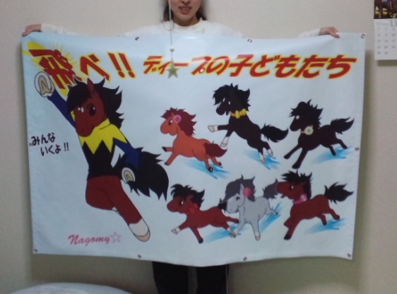 こんばんは。~馬と小鳥の雑貨屋~なごみぃ工房 管理人のなごみぃ☆ですとりあえず風邪は脱出したけれど…なんだかんだで寝れない日々を過ごしているなごみぃ☆です…って、やりたい事やりまくってるだけなんですけども~(笑)さてさて、今日は久しぶりに競馬ネタです。なごみぃ☆、初の「横断幕」を制作中だった訳なのですが…完成品が届きました~!!! ※真ん中に浮かんでる★マークはただの電気のヒモです…ハイ(汗)想像していたより大きくてびっくり!!「作りたい!!」となったら見境なくなる私なのですが…下調べも何もせず、目算で寸法を決めて発注しちゃった私…「それ、大きすぎて張れないんじゃないの?」と旦那さんにツッコまれ、あわてて調べてみました。…と、一応OK縦の長さが既定の限度ギリギリでしたが、大きさはクリアみたいです。競馬を御存じない方は「なんのこっちゃ??」とハテナマークだと思うのですが競馬場ではレース前に馬を引いて歩く「パドック」というのがありまして、そこで馬の様子を見たりするんですけれども、その柵にこういう横断幕を張れるんですね。で、好きなお馬さんを応援したりするんですが…張るには許可が必要で、色々と規定があるんです。今回、それをな~んにも考えず、勢いだけで作ってしまったワタシ・・・・当日、本当に張れるのかどうか心配になってきましたとりあえずわかったのは、「個人名を書いてはイケナイ」という規定もあるらしいということ。今回、右下に「Nagomy★」と入れちゃってるんで、それは消していこうと思いますせっかく参戦したのに、張れないなんて絶対イヤダ~!!ということで…来る11月14日(日)京都競馬場にてなごみぃ☆横断幕デビュー!!いたしますので、見かけた方はお声かけ下さると嬉しいですあとたぶん、競馬中継とかでテレビに映ったりしてたら…「観たよ~!!」とコメント下さると嬉しいです~と、いうわけで、今週末、頑張ります!!(笑)