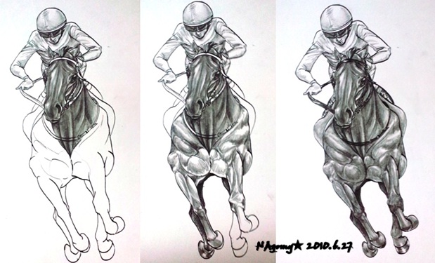 8月初頭に開催される「アーティスティック・ポストカード展」に向けて目下制作中!!のなごみぃ☆です。相変わらず馬ばっかり描いているのですが、馬だけは何時間、何頭描いても飽きないし、不思議なものです。そして、制作時間もやたら早い^^;一番難しいのが上に乗ってるジョッキーだったりするから、難儀なものです(笑)今日出来上がったのが↓コチラです。これをどう「作品」に仕上げるのかは、私の中でもまだ未定。。。こんだけのものをポストカードサイズに詰め込むのは、骨がおれるかも…と、自分で描いときながら不安がってる私。。。「描きたい!!」ってなると、見境いなくなるのが私のイケナイところです;;「ギャラリー展示用の制作」って、初めてだけど、とってもわくわくしているなごみぃ☆でした。完成品のUPはとりあえず、ギャラリー公開後になりますのでご了承ください~