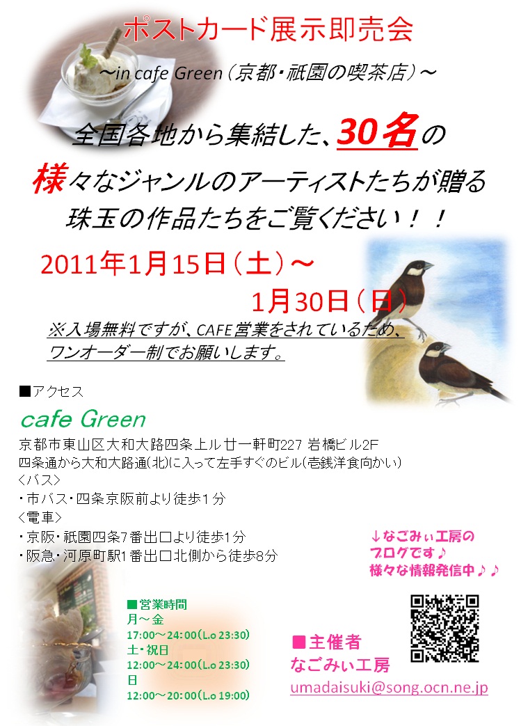 こんばんは。なごみぃ☆です。更新が超・久々になってしまってすみません;;何をしていたかと言いますと…↓↓の展示会の準備をしておりました~!!この度、cafe Greenさんのご協力により、ブログ上で知り合った方々と京都・祇園にて合同の展示会を開催することになりました~!!!以下に詳細を記載させて頂きます。一応、私も参加します(笑)もし可能ならば、高校時代に制作した超・力作も展示してもらえるかもしれません^^お近くの方は、ぜひお立ち寄りください~!!ポストカード展示即売会~in cafe Greenさん~全国各地から集結した、30名の様々なアーティストたちが贈る珠玉の作品たちをぜひご覧ください!!■開催日平成23年1月15日(土)~1月30日(日)■会場京都・祇園にあるカフェcafe Greenさん ■入場料入場料:無料※ただしCAFE営業をされているため、ご入場の際はワンオーダー制でお願いいたします。■アクセス京都市東山区大和大路四条上ル一軒町227 岩橋ビル2F四条通から大和大路通(北)に入って左手すぐのビル(壱銭洋食の向かい)<バス>・市バス 四条京阪前より徒歩1分<電車>・京阪 祇園四条駅 7番出口より徒歩1分・阪急 河原町駅 1番出口北川から徒歩8分地図はこちらをご覧ください。 ↑cafe Greenさんののぼりです。この花屋さんが入っているビルの2階です本当に全国各地から(北は北海道、南は沖縄!!)様々なジャンルのアーティストさんたちがご参加表明してくださっています(感謝感謝ですっ)特別参加として、アメリカ在住のマイクさんからも、素敵な作品をお預かりしております会期中は、作家さんたちのポストカードの即売会も実施しています。お気に入りの作家さんを見つけて、作品をゲットしちゃいましょう♪なお、会場であるcafe Greenさんは、会期中もCAFE営業をされているため、ご入場者の方はワンオーダーをお願いいたしますとっても美味しいメニューが盛りだくさんですので、こちらも楽しみに御来場くださいね↓↓ちなみに…私が試食してきた、とっても美味しいメニューたちをご紹介しておきます~(笑)エスプレッソバニラバニラアイスに、暖かいエスプレッソの苦みがなんとも言えませんバゲット(正式名忘れちゃいました;;)こちらはほうじ茶アイスに、黒蜜風味のハニー、あんこ&きなこのトッピングという、和スウィーツ好きにはたまらないトッピングづくしの一品!!とろけちゃうこと間違いなしです!!ポストカード目当てに来るも良し、↑↑の美味しいお料理目当てに来るも良し(笑)皆様のご来場を、お待ちしております~開催期間中、私も出来るだけ来場したいと考えています。このブログ上で来場の予定をお知らせしますので、たくさんの方と交流出来れば幸いです。どうぞよろしくお願いいたします。