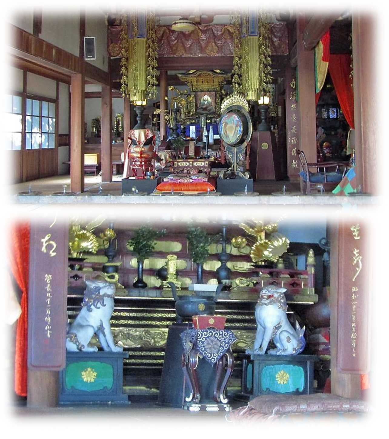 本尊の前の陶製狛犬は全身白、鬣は金色で背筋を伸ばした凛々しい姿。