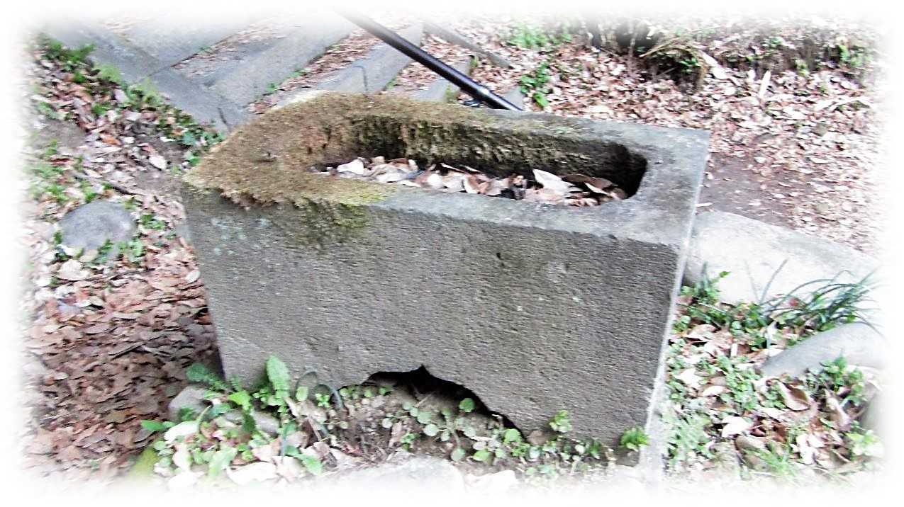 石段脇の手水鉢には寄進年や文字、家紋などの痕跡は見られなかった。