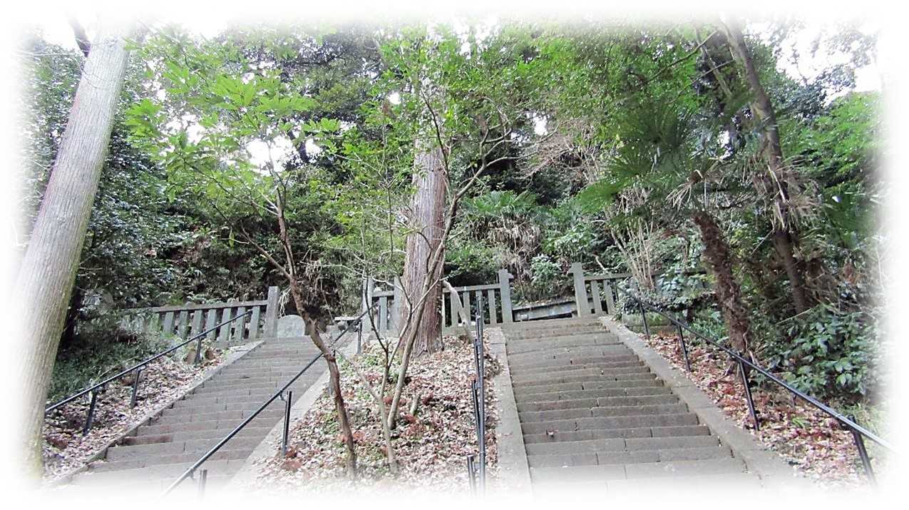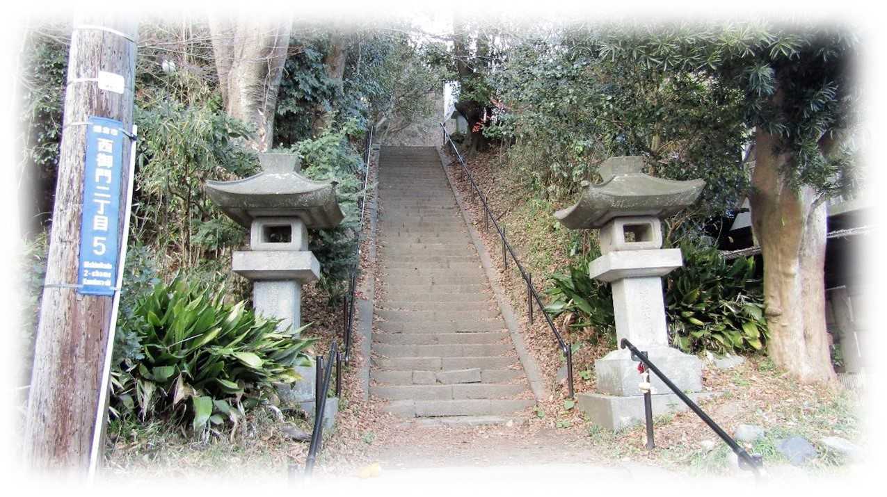 石段両脇に常夜灯が立てられ、石段の先が北条義時法華堂跡がある。