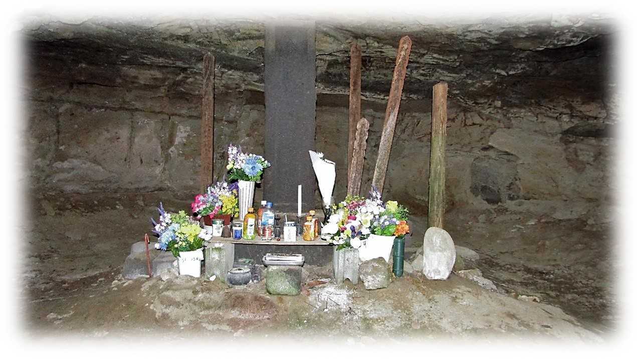 「やぐら」と呼ばれる洞窟は入口は狭いけれど、内部は左右に広がりがあり、供養塔へは屈まなければ近づけません。
