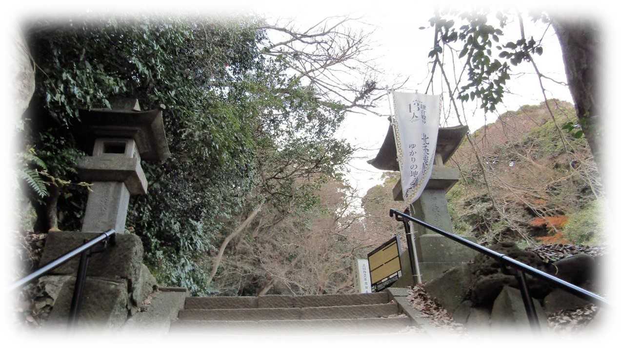 白旗神社(大蔵白旗神社)と頼朝墓を後に、山裾沿いを東に向かうと左手に北条義時法華堂跡に続く石段が現れます。