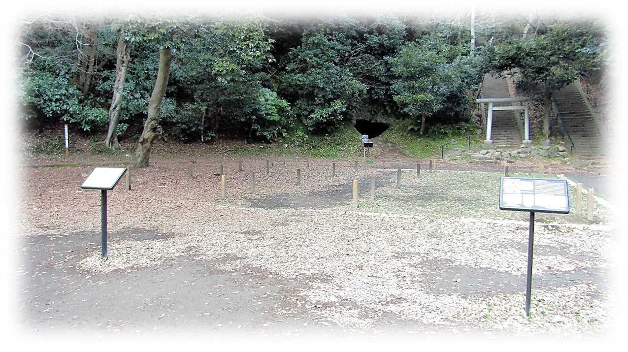 鳥居左の山肌には「やぐら」と呼ばれる洞窟の入口が見えます。