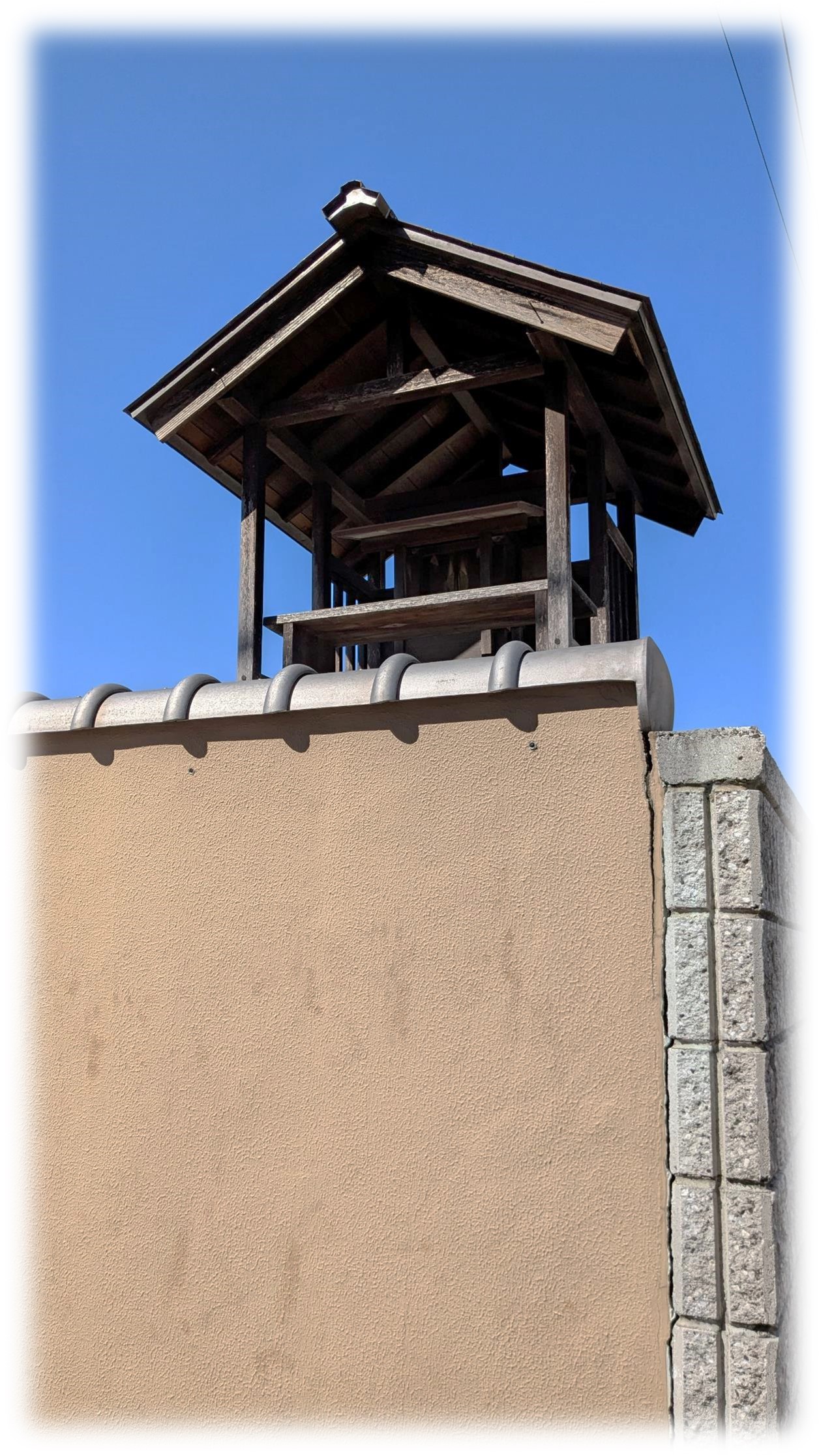 歩道沿いの塀の先に社を収める覆屋が高い土台の上に組まれ、通りから塀の上の社が見えるように祀られています。