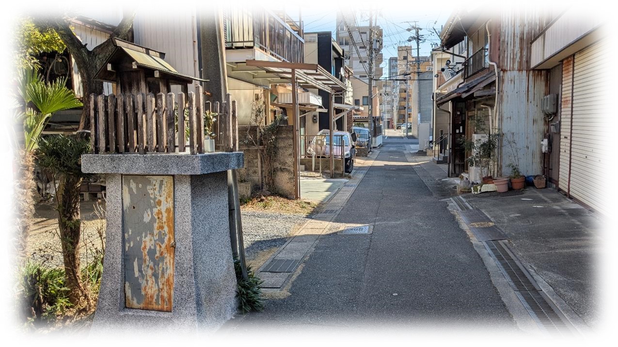 住宅が密集する細い路地に祀られた姿から恐らく秋葉神社のように思われます。