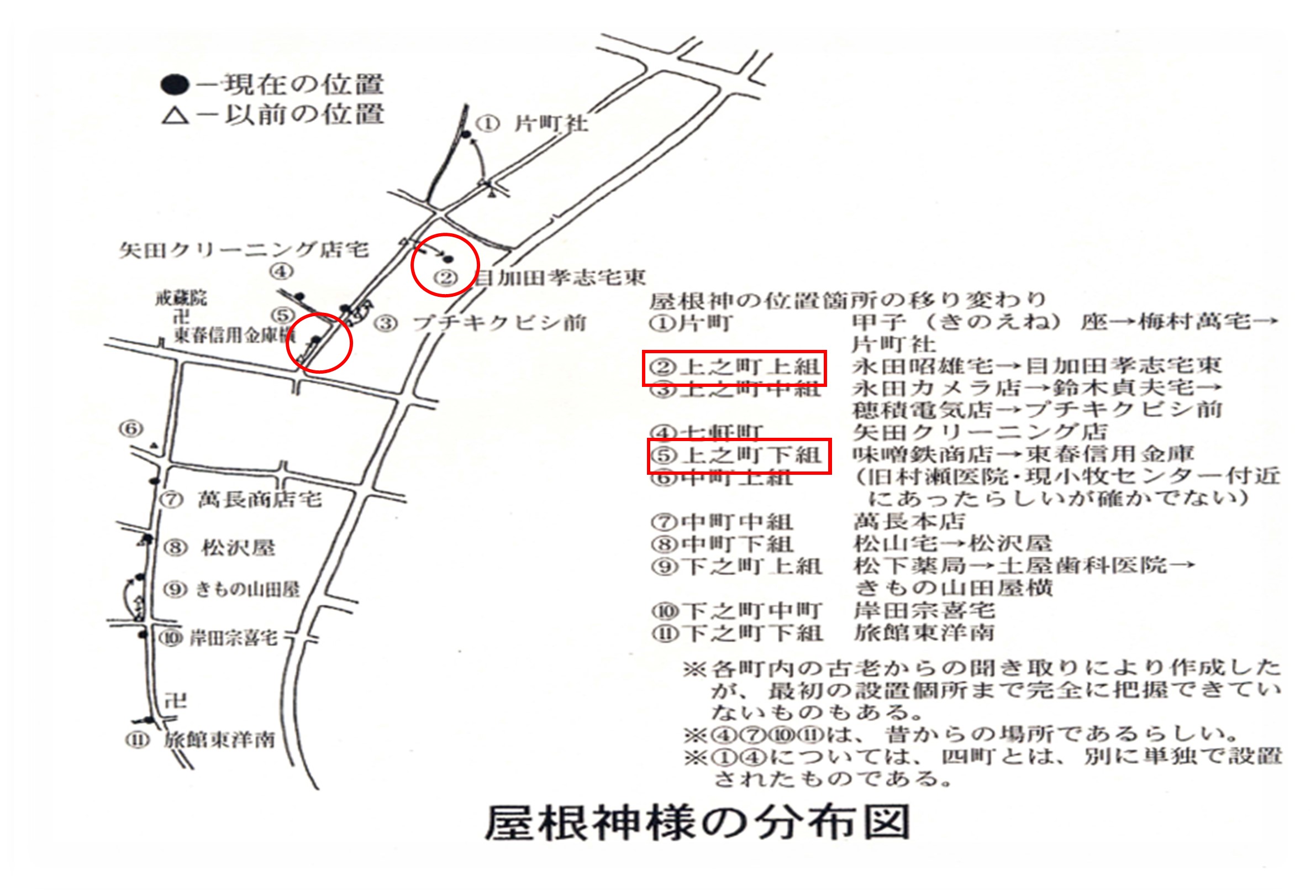 上は小牧市の屋根神分布図、戒蔵院の位置から判断して、この社は上之町下組の屋根神さまと思われます。(図中の目標となる店舗名など、現状とは多少乖離あり)