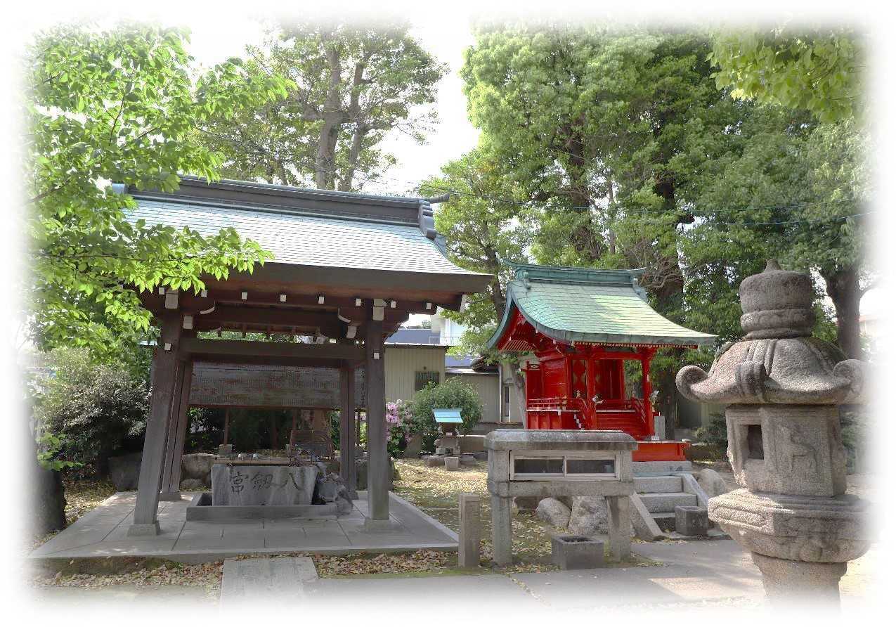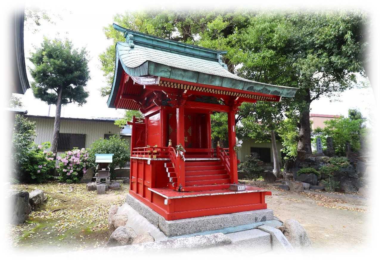 手水舎右の津島天王社、朱が鮮やかな社です。
