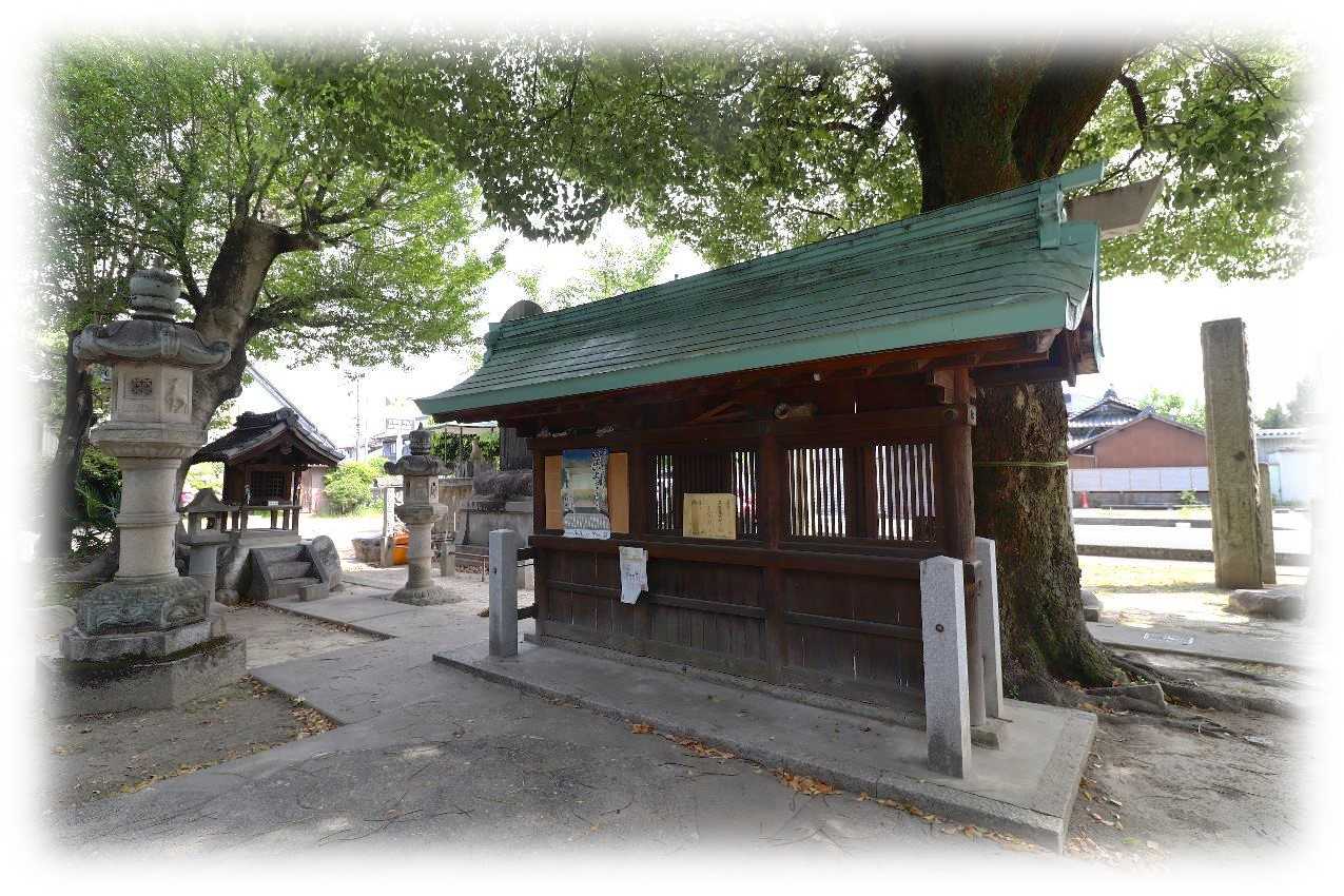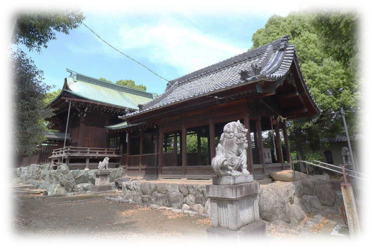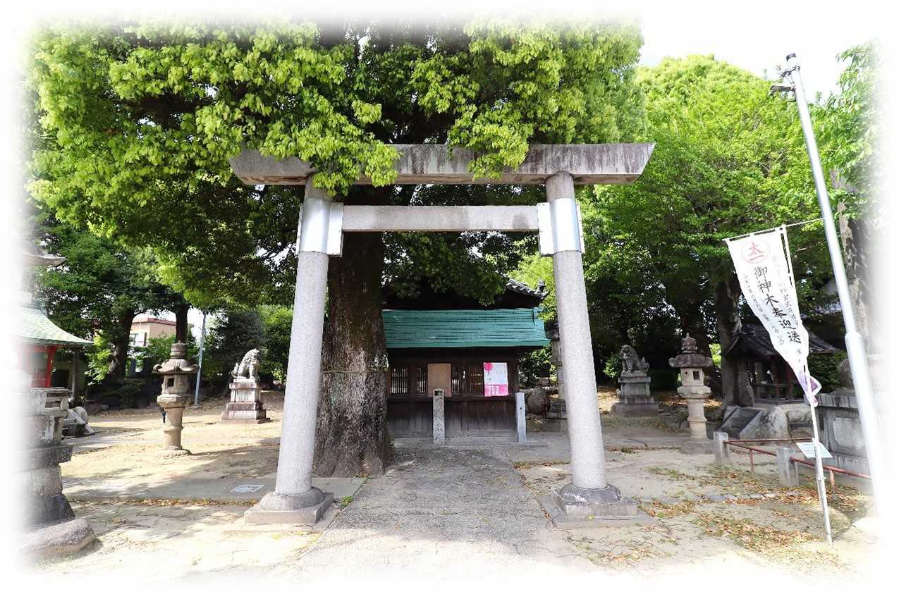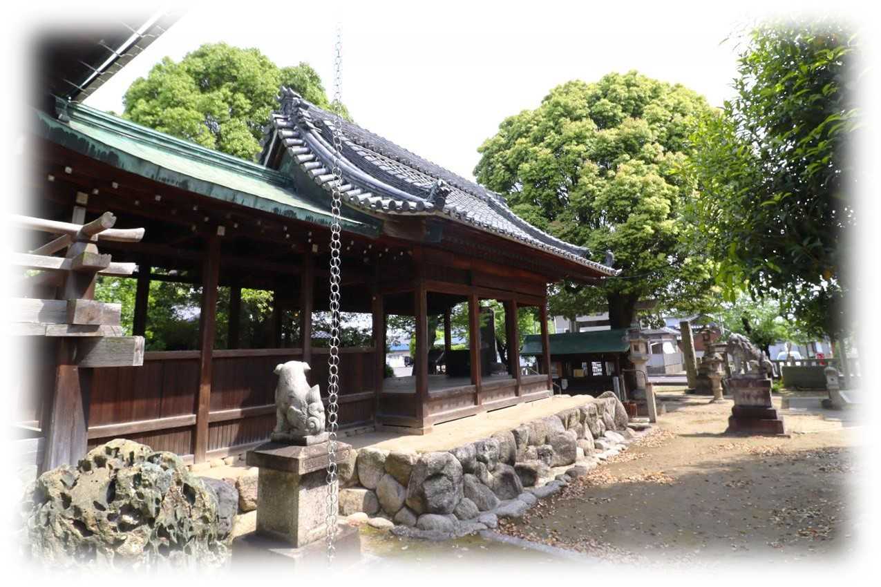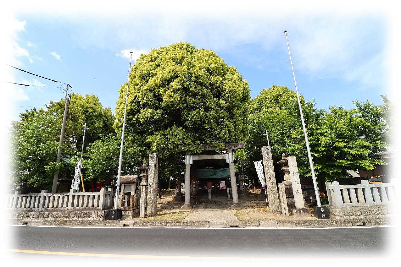 五条川に沿いに整備された尾北自然歩道の東側に南北に長い社地を持っており、住宅が広がる一帯にあって、大きな楠が何本も聳える緑豊かな杜を持っています。