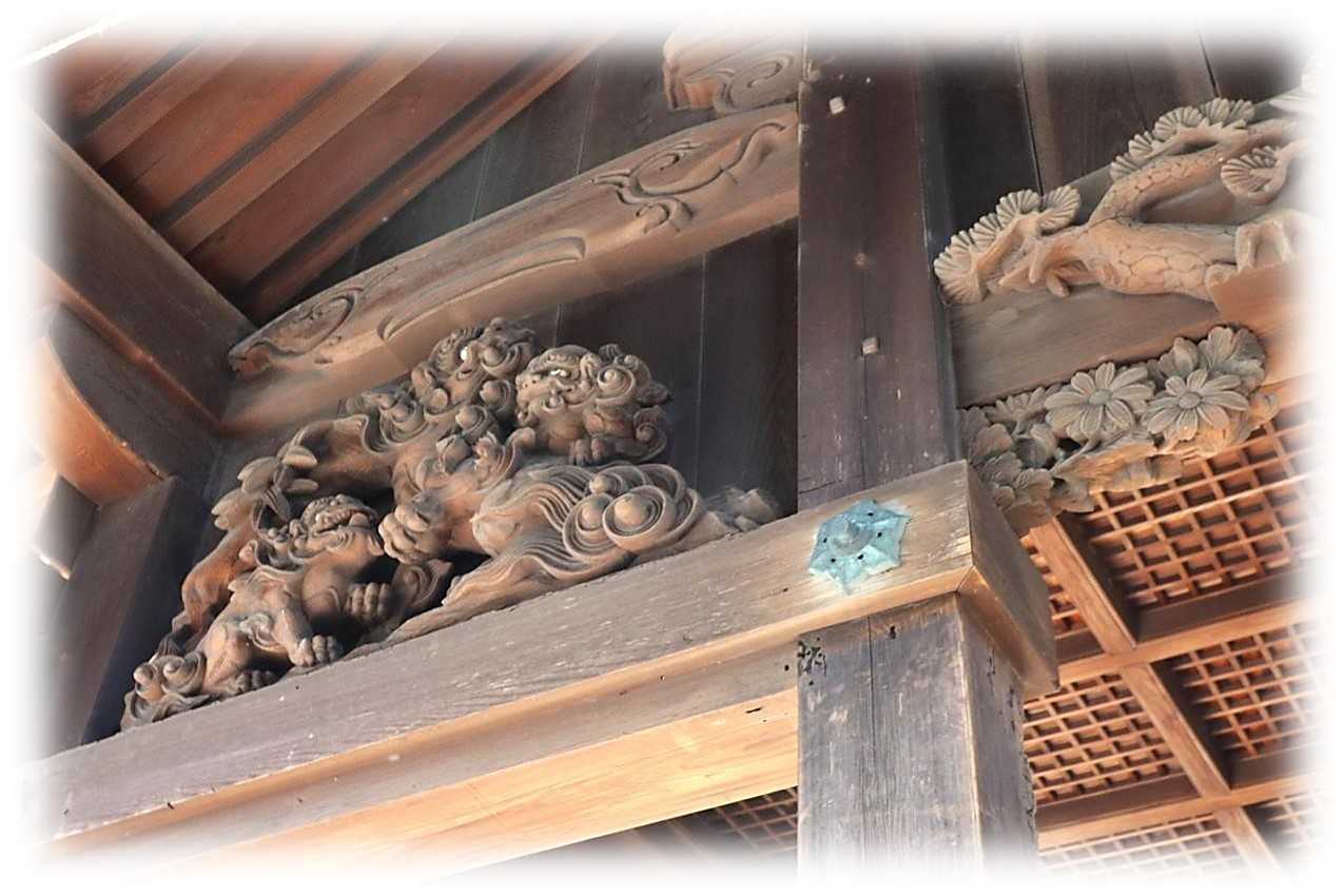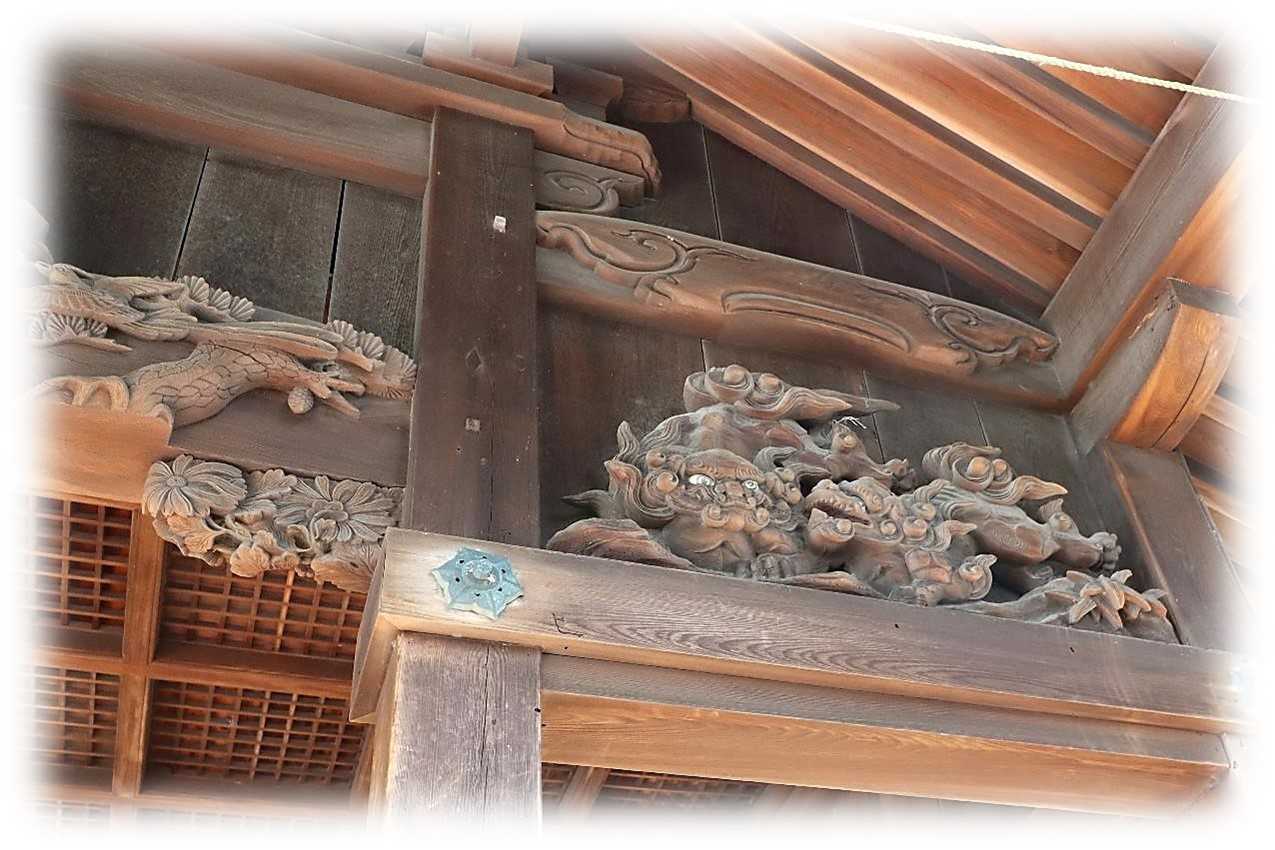 右も獅子のようです、どちらも梁を支える挿肘木の装飾は手の込んだものです。