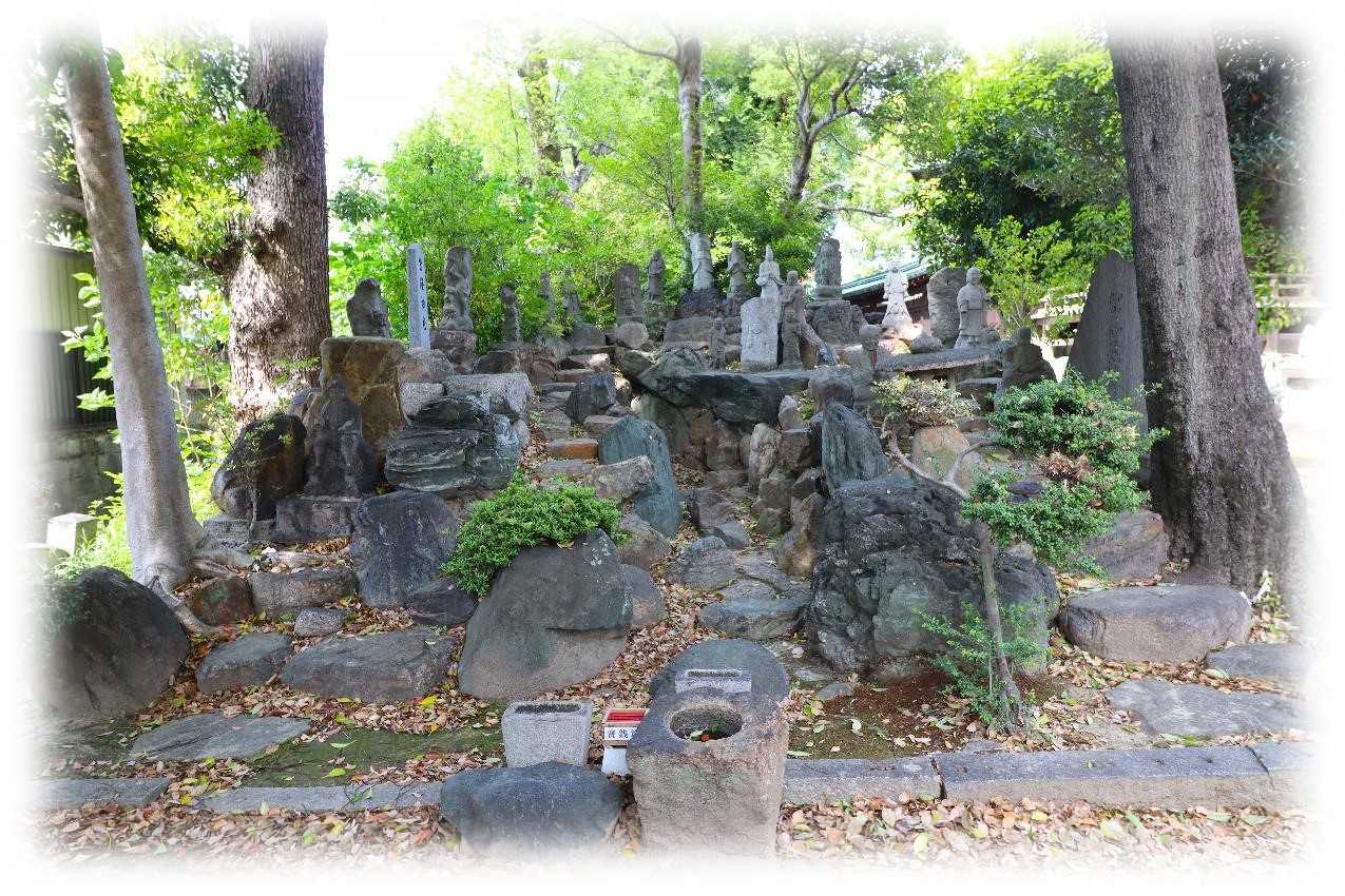 辨財天の右は、役行者や不動明王の石像、眷属の三六童子や金峰神社の石碑が安置されています。