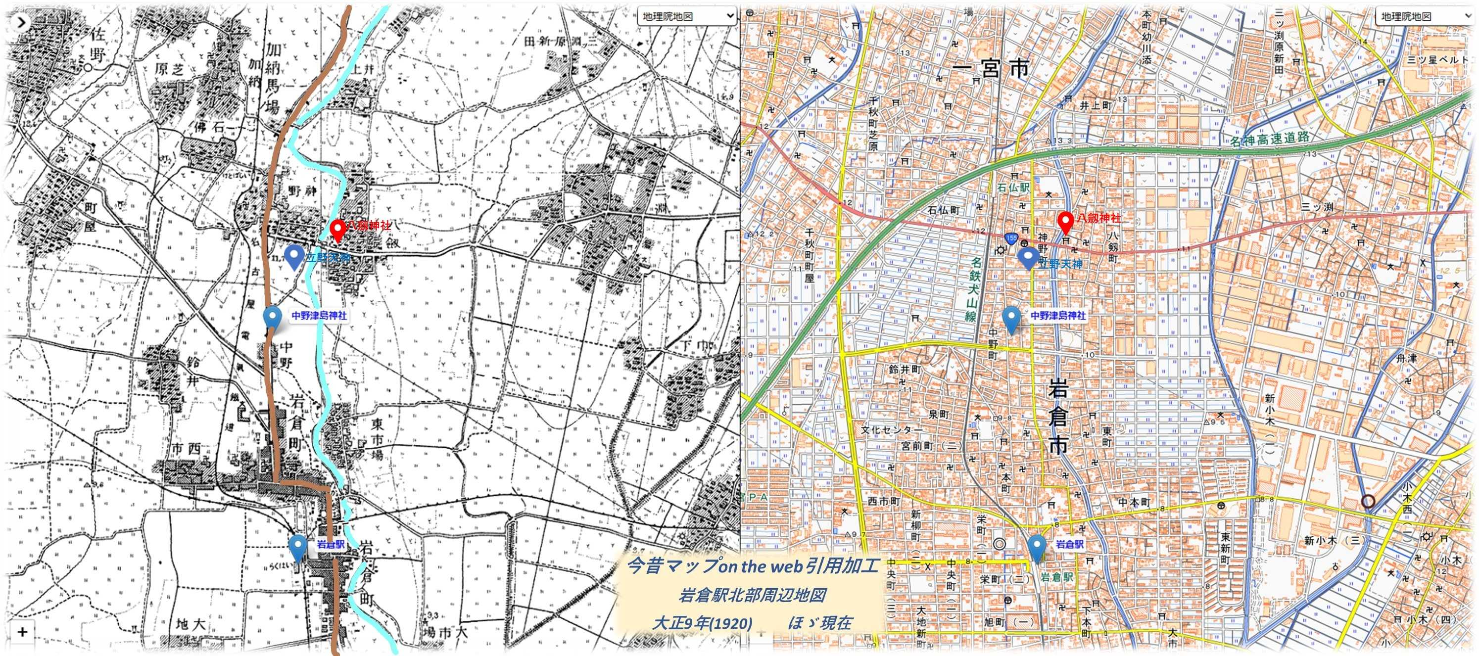 上は大正初期とほぼ現在の地図で鎮座地の変貌ぶりを見ています。