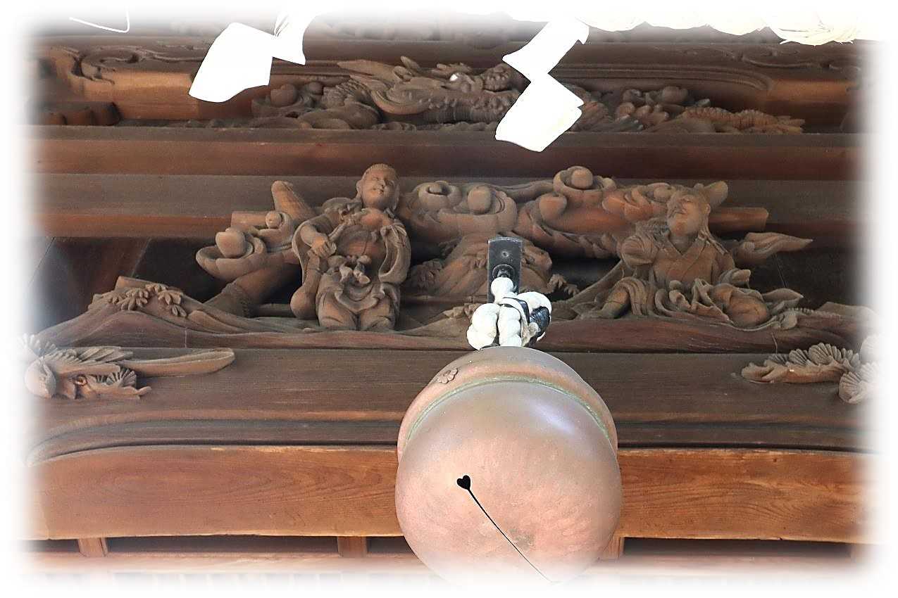 四方吹き抜けの木造拝殿で、妻壁に施された彫飾りは手が込んだものです。