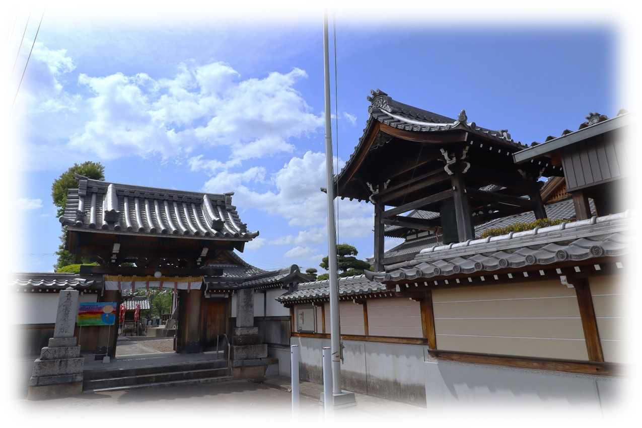 路地から北方向の眺め、二層屋根の堂々たる本堂が印象的な伽藍です。