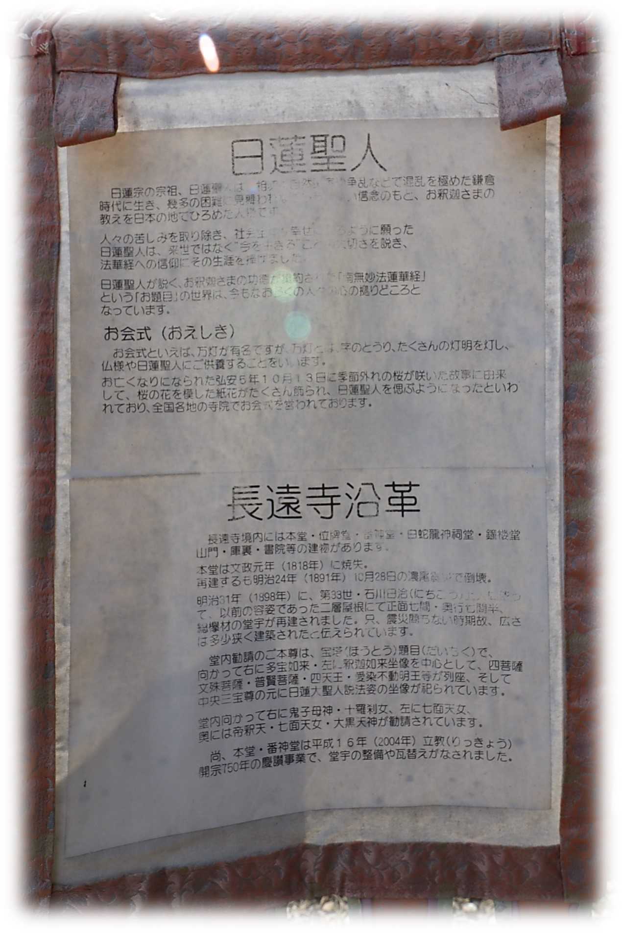 宗祖像手前に長遠寺の沿革が掲示されていました、一部抜粋した内容は以下。