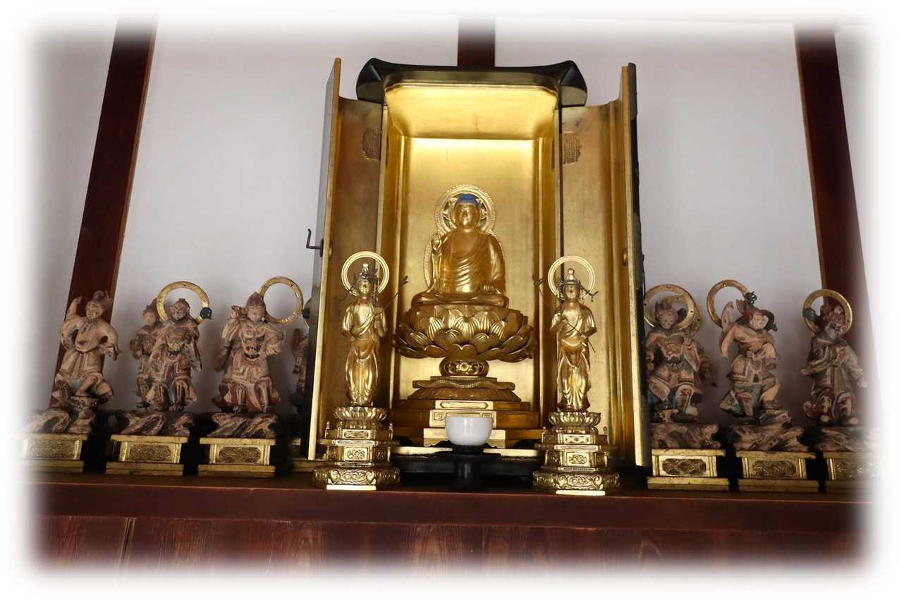 右手の堂内は中央には薬壺を持った薬師如来像、脇侍の日光・月光菩薩と12神将が安置されています。