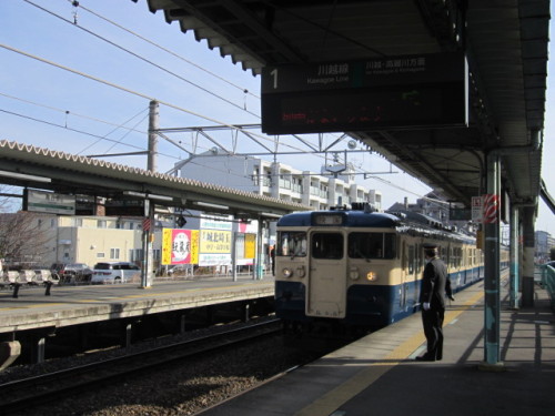 JR川越線は、大宮口では205系か、りんかい線の70形が主で、運転区間も川越~大宮~武蔵浦和~赤羽~池袋~新宿~大崎~りんかい線新木場と、比較的シンプルなパターンだ。そんな中、この日は駅からハイキングの関係か、臨時快速「おさんぽ川越」が運転された。運転区間も、新習志野(京葉線・武蔵野線・武蔵野貨物線・大宮・川越線)という、かなり凝った経路で、車両も豊田のスカ色115系6両編成が使われたのがなんとも嬉しい南古谷駅に進入するスカ色115系の「おさんぽ川越」。車内は、これから川越を散策する人でいっぱいだ。川越駅に着くと、駅社員が「ようこそ小江戸川越へ」の横断幕をもってお出迎えしていた。近郊型の典型である115系の車内。今後の動向が気になる。川越駅に停車中の「おさんぽ川越」号。JR川越駅に近郊型車両が来るのは珍しい。東武東上線から地下鉄副都心線を経由して東急東横線に直通運転するのも、あと1ヶ月と1週間になった。駅構内には、川越市のゆるきゃら「ときも」の姿もあった。名産のサツマイモの上に名所「時の鐘」をのせている。「ときも」の後姿。芋らしく、ちゃんとブツブツもある。※当ブログを「にほんブログ村」に登録しました。ポチよろしくお願いしますにほんブログ村にほんブログ村にほんブログ村