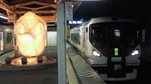 JR中央線高尾駅のホームには天狗の顔の像があり、その大きさはかなり迫力がある。日中の高尾駅(2012年11月10日の日記)そして、夜になると天狗の像がライトアップされ、暗闇の中に天狗の顔が浮かび上がり、迫力を超えて、少し怖くもあるライトアップされた天狗像と、中央ライナー3号として高尾に到着したE257系 中央線快速のE233系。何も知らずに夜に高尾駅に着くと、その姿にビックリするだろう。E257系と長野色の115系(右)。いずれは、長野色帯の211系も来るのだろうか。※当ブログを「にほんブログ村」に登録しました。ポチよろしくお願いしますにほんブログ村にほんブログ村にほんブログ村