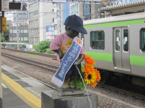 7月に入ったがまだ梅雨の最中で、強い雨が降ったと思ったらやたら暑い日になったりと気候の変化が激しく、体調には気を付けたいですね今回の浜松町駅の小便小僧は「社会を明るくする運動」のタスキを掲げていた。法務省によって行われている運動のようで、犯罪や非行を防止し、地域で立ち直りを支援する運動の様だ。最近のニュースを見ても、老若男女問わず様々な犯罪が起きており、もちろん罪を犯した本人が問題かもしれないが、それ以前に、家族や職場、学校、地域など、様々な支援があれば防げる犯罪もあったに違いない。最近は人との触れ合いが少なくなってきたといわれるが、多少おせっかいと思われても、支援できる場では支援したほうがいいのかなと思ってみた今日この頃です。法務省・社会を明るくする運動のページ「社会を明るくする運動」のタスキをしている。本当に、少しでも明るい世の中でいてほしいものだ。185系の回送列車元AKB48の前田敦子を起用した、転職サイト「マイナビ」のステッカーを貼った山手線E231系。最近の報道で、山手線にE235系という新車を導入する計画があり、どんな車両た楽しみだ。 キティちゃんを起用した日本旅行のステッカー。まもなく夏本番で、そろそろ夏の旅の計画を立てたい頃だ。※当ブログを「にほんブログ村」に登録しました。ポチよろしくお願いしますにほんブログ村にほんブログ村にほんブログ村