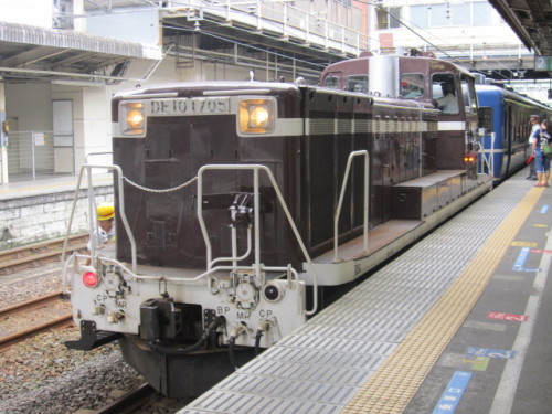 上越線では、高崎~水上に「SLみなかみ」号が土休日中心に運転されている。所要時間は約2時間で、D51-498またはC61-120のいずれかが牽引している。快速列車の普通車指定席の扱いなので、比較的安く乗ることができ、指定券を買えば青春18きっぷでも乗車できるのがうれしい。というわけで、8月14日の青春18きっぷの旅では、このSLみなかみに乗ってきました。高崎駅に着いた頃にはすでに入線していて、最後尾には茶色のDE10ディーゼル機関車が連結されていた。そして切り離されてすぐに引き上げていった。SLみなかみには特急タイプの方向幕も用意されている。なぜか「SL試運転」なんていう幕もあった。時期に応じたヘッドマークも用意されている。今回の機関車はD51(デゴイチ)だが、ホームは案の定撮影者でにぎわい、うまく撮るのに一苦労だ客車は12系なので、国鉄時代と変わらない青いボックスシートで、懐かしい旅が楽しめる。車窓に映る煙がSLが引っ張ているのを実感させる。渋川では約20分くらい停車し、ホームでの撮影も楽しめる。記念撮影用の小道具もいろいろ貸してもらえる。渋川駅のホームでは名物の「焼きまんじゅう」が売られていた。パンのようなまんじゅうに甘い蜜を塗られたのが特徴で、おやつにもちょうどいい。ホームの反対側に115系の普通高崎行が到着。国鉄車両の2ショットとなった。渋川を出ると利根川沿いを走り、景色もよくなる。名撮影地でもある。水上辺りでは利根川のラフティング(ゴムボートでの渓流下り)もできる。ラフティングと温泉を組み合わせた水上旅行も楽しいかも無事水上駅に到着し、隣のホームに停車中の「リゾートやまどり」と顔を合わせる。水上駅の改札では水上温泉のキャラクター「おいでちゃん」がお出迎え。JR東日本高崎支社のページ※当ブログを「にほんブログ村」に登録しました。ポチよろしくお願いしますにほんブログ村にほんブログ村にほんブログ村