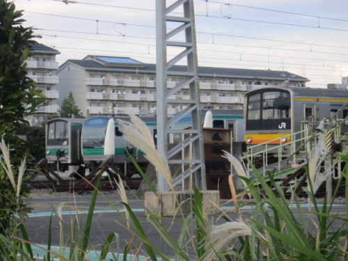 川崎と立川を結ぶJR南武線にも新車のE233系が導入され、当然、それまで走っていた205系や209系は同線では御役御免となってしまう。その205系の1編成が川越車両センターにいて、現役では実現しない緑帯の埼京線E233系と黄色主体の帯の南武線205系の対面が実現した。敷地外からの撮影のため少々見づらいが、手前から南武線の205系、埼京線のE233系、埼京線の205系の3ショットが実現。埼京線E233系と隣り合わせ。今時珍しい幕式の行き先表示で、南武線らしく「武蔵中原」と表示してあった。果たして今後はどうなるのか?廃車?他の路線や鉄道会社に行くのか?それとも海外に行くのか?車庫の先は木でおおわれているが、色づき始め、秋を物語っている右側の柿の木もだいぶ実ったようだ。その脇にある南古谷駅に川越行の電車が到着。※当ブログを「にほんブログ村」に登録しました。ポチよろしくお願いしますにほんブログ村にほんブログ村にほんブログ村