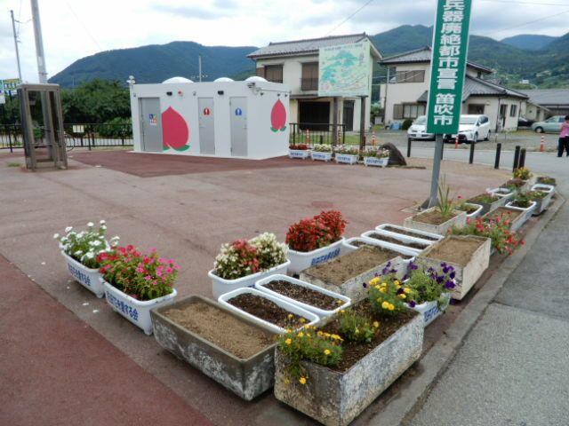 反対側には花壇と桃のイラストが描かれたお手洗いがあり、無人駅ながら整備されています