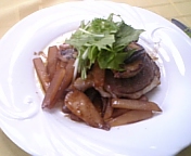 神戸から帰ってきました~が 旅行報告の前に~久々の『うちご飯』 クリスマス前にしか見かけないフォアグラが 半額になっていたと旦那さんが買ってきたので パートさんに頼まれたようですが・・・ 他にも黒毛和牛のステーキに鴨肉 ・・・・2人家族なんですが まあこんな田舎で買う人もいないので ・・・・協力って事で 下に塩コショウして焼いたステーキに 塩コショウして小麦をはたいて焼いたフォアグラ そのフライパンで焼いた大根に赤ワインと醤油胡椒で 味付けしたものをかけて・・・緑がないから 頂いた水菜・・・・美味しい 美味しかったけど・・・ちょっとお肉が・・・ ヒレ肉とかあっさりしたお肉のほうがあいますね 旦那さんは喜んでましたが・・・大根があっさり 食べた後姉が来たので 鴨を焼いてその脂でフォアグラ焼いて またその脂で大根いためて赤ワインと醤油とみりん 塩コショウで味付けして出したらこれも喜んでくれました 鴨は切ってお醤油お出汁みりん酒で作ったスープに入れ 水菜ときのこねぎでお鍋にしましたが 姉が旦那さんにと持って帰ったので画像はありません うちはその残ったスープにつみれや野菜たして・・・ うちのクリスマスは終わったな 後はシャンパンとケーキね