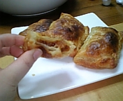 先日の残りのチーズを使うため 半額で買ったパイシートを解凍 この間ミスタードーナッツで買った『ハムチーズ』 が美味しかったので~ 作ってみる事に そしたら友人が来て・・・・ ナイスタイミング 画像撮りませんでしたが 後から旦那さんのを撮らせてもらいます 『ハムチーズ』でした 家でこんなに簡単に『ハムチーズ』が出来るなんて・・・感激 それに『マリボー』ってそのままより 溶かして食べるとより美味しい よく半額になってるけど 味もわからないし~『チェダー』とか 無難名前のものばかり購入してましたが・・・ これからは買ってこようっと 230度で12分・・・簡単・・・ で残ったパイシートで『アップルパイ』 この間りんごをいただいたので バターで炒めて少量の砂糖とレモンとハチミツ入れて よ~く煮詰めてたんですよね もちろんシナモンもたっぷり 美味しい~ ハチミツだから甘すぎず~ でもカロリー高そう パイシート自体バターたっぷりですから・・・ だからと言って『ミスド』で買わないかって言ったら 買いますからね・・・・ 中身の甘さだけでも自分で調整できるのは 手作りだからできること・・・・なんて 自分に言い聞かせていますが 久々に手作りお菓子だけど~やっぱりいいですね 冷凍シートだともっと便利だし 冷凍食品半額の日に買っておくと経済的かも 次は『ハムたまご』作りた~い 次の冷凍食品半額っていつだったけ