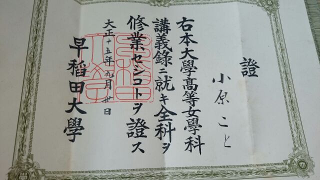 免疫抑制剤の副作用で苦しんでいる。もっとも拒否反応以外の副作用は副作用のうちに入らないので我慢するしかないのだが、いろいろ不快で体調が悪い。また、時期的にどうしても忙しく日記を書けないでいる。妹が「うちの、ばあちゃん、早稲田大学で勉強していたって知ってた?」と言うので、何のことかサッパリわからなかった。父から聞いた話では、俺んちの祖母は、高等小学校卒ということになっているし、また本人からも、どんな学校へ行って、どんな勉強をしたなんて聞いたことがなかったから。母が亡くなり、弟が遺品整理を始めているのだろうが、古いアルバムに挟んであった封筒の中に、なんと早稲田大学と書かれた証明書があったのである。 よく見ると、「高等女学科」とある。調べてみると、これは今でいうところの通信制大学みたいなものらしい。当時の学生証も保存してあり、その裏側を読むと、自由に大学内に立ち入って、図書館なども利用できると書いてある。恐らく、スクーリングみたいなものもあったのだろう。調べてみると、これを終了すると専門学校の受験資格が得られたということなのだが、なにしろ90年も昔、大正時代のことなので、その専門学校がなにを指しているのかはよくわからない。謎なのは、どうして祖母はこのことを家族の誰にも語らなかったのであろうか。今となっては確かめようがないミステリーになってしまった。このことを、いま現役の早大生である娘に伝えると、ひどく驚き、感心していた。「ひいばあちゃんは私の先輩だったんだね」早稲田は俺の母校ではないが不思議な縁のある大学だな・・・。