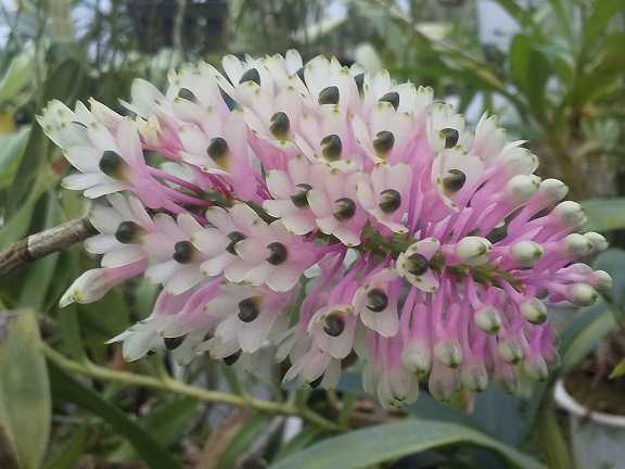 着生ランで葉の落ちた古いバルブに花を付けます。