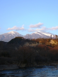 小諸の眺望百選(28)千曲川とつり橋 小諸を歩くと、いたる所で千曲川に出合います。千曲川の遠景は、浅間山(手前の剣ヶ峰が雪の浅間を3分の2ぐらい隠している)地図を片手に、3日連続体調維持のためのウォーキングをしました。1日目は、55分間で6247歩、2日目は、59分間で6892歩、3日目は、52分で6366歩で、合計11.9km歩いたことになります。以前から歩くときには、ウエストの所に付ける歩数計を愛用していましたが、付け方が悪いと、相当歩いたのにカウントできておらず、がっかりしたことがあるので、新しい歩数計を買ったのです。(NHKの中山道てくてく旅で、勅使川原さんがリュックから取り出しているのを見て)性能が良くなっていて、7日前のメモリや消費エネルギーまで付いていて、感心しました。 千曲川の向うの山に沈む太陽藤村の千曲川旅情のうたを刻んだ小諸大橋やつり橋を歩きます。暖冬とは言え、帽子とマフラーと手袋の3点セットは、離せません。坂の町小諸を歩くと、また新しい発見があります。