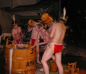 今日は大寒、1年で一番寒い頃だと思います。どこも最低気温は、零下だったようです。昨晩は、御代田町の草越で「寒の水」の行事がありました。昨日はとても寒く、夕方から出かけることと、水をかぶるらしいとので、聞いただけで身震いしました。草越の公民館前に着くと、火が赤々と燃え、振る舞いの具たくさんうどんを戴くと、見物の私たちはぬくぬく。しばらくすると、藁で編んだ兎巾(ときん)を頭に、わらじに赤いふんどし姿の裸の男性たちが50~60人ぐらいの人が、走り出てきました。 4ヶ所で、桶に用意された水を勢いよく浴びながら、町内を走りぬけていきます。「今年成人式!」と言いながら、見物人の「よいしょ!」「そら、もう一杯」という掛け声にあわせて、桶の水を何杯も浴びていました。とても威勢のいいお祭りです。地面には3日ほど前から降った雪、そして空からも小さな雪が舞っていました。 頭に着けた兎巾(ときん)は、近くの熊野神社に奉納してから、また水をかぶりながら公民館前にもどってきて、大きな焚き火で体を温めていました。五穀豊穣と無病息災を願っての行事ですが、昔は行者がやっていたそうです。でも、10代から50代のたくさんの人が参加して、1年で一番寒いこの時期に、水かぶりの行をするのには、驚きました。長野県の無形民俗文化財の指定をうけているそうです。いつまでも受け継いでいってもらいたい行事です。