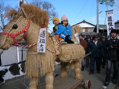 昨日(日曜日)は、中山道小田井宿の道祖神祭りでした。数年前に、大きな藁馬が奉納されている長倉諏訪神社を見たとき、この藁馬を子どもたちが引くお祭りがあるのを知って、一度見たいと思っていました。朝9時に、公民館前に集まった子どもたち、父母、地区の長老の皆さんが、準備していた藁馬を引いて、練り歩き始めます。往来は、未だ融けない雪道、でも、誰も「寒い!」なんて言いません。 「今日は道祖神のお祭りだ みんな仲良くお祭りだ 交通事故のないように 無病息災すこやかに みんなでお祭りいたしましょう」 道祖神の前に来ると、みんなで無病息災を祈ります。 おじいちゃんから子どもまで、一緒に手をあわせて街道の道祖神にお参りします。 子どもが乗れるほど、丈夫にしかも馬の等身大に作ってある藁馬は、板車に乗せてみんなで綱で引っ張っていきます。「道祖神祭り」って書いた子どもたちの書も、馬に付けてありました。地区の三世代で、伝統を守っていっていることに、感動を覚えます。 こんなかわいい藁馬もありましたよ。