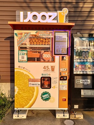 全国各地、特に大都市圏を中心に増えてきているオレンジジュースの自販機。実際に目立つようになってきたのは2年前からですが、ここ最近は駅や空港でも置かれるようになり、値段は幾分かするにせよ缶ジュースよりも飲まれるようになってきています。生絞り自販機の中でもよく見られるのが、シンガポールに本社を置く I JOOZ の自販機です。1杯350円と新幹線の挽きたてコーヒー自販機の価格帯と同じですが、搾りたてのジュースが飲めるため、一定の需要はあるようです。自販機からはオレンジが丸見えになっていて、生絞りをしっかりとアピール。350円を入れると中に挿入されているプレス機が稼働し、オレンジ4玉分の果汁が絞られて出てきます。こういった目に見える演出がお客さんを呼び寄せるミソなんですよね。出てきた搾りたてのジュースがこちら。オレンジをそのまま絞っただけなので糖類、添加物は一切なし。濃縮還元ではないので、あっさりした甘みです。ジュースは最近飲んでいなかったので、ビタミンCなどの栄養補給にはうってつけでした。実はスーパーで売られている100%ジュースはほとんどが濃縮還元で、栄養価も丸絞りに比べるとビタミンCやミネラルの含有量も違ってきます。多少値は張りますが、移動中や旅行先の栄養バランスや体の調子を整えるのには断然よいので、砂糖入りのドリンクを携帯するよりは健康に気を使えるアイテムになるでしょう。スタバやコメダなどが近くにないときは、この自販機をオプションにしても面白いですね。