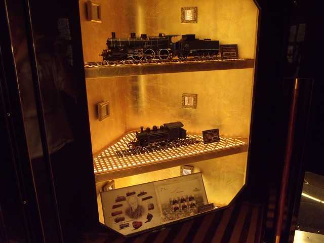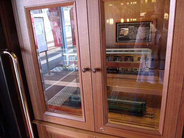車内に入ります。ディスプレイには車両の改造のヒントとなった原信太郎氏の鉄道模型が置かれています。
