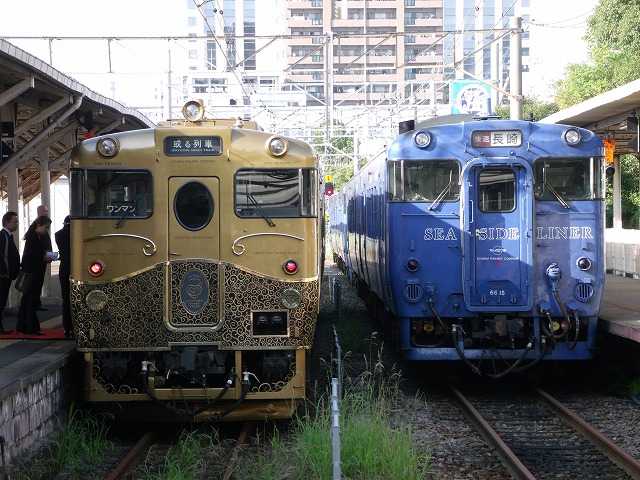 一旦、長崎で撮った写真を掲載します。改造の種車はキハ47で、原形の形はほぼ残っていますが、外装・内装ともに一般形気動車を大幅に別物に改造して誕生しました。その工費はニュースでも話題になりましたが、2両合わせて6億円かかったそうです。右は引退が近づいているキハ66です。長崎駅は現在、新幹線工事の一環として高架化されたので、地上で並ぶ姿はもう見られません。思わぬ貴重なショットになりました。